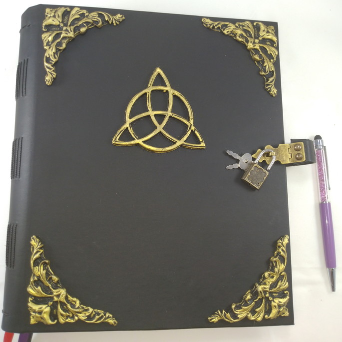 A capa em couro sintético ptreto traz pureza e força, enquanto o Triskle dourado modelado à mão em resina e porcelana fria simboliza proteção e conexão com os cinco elementos.