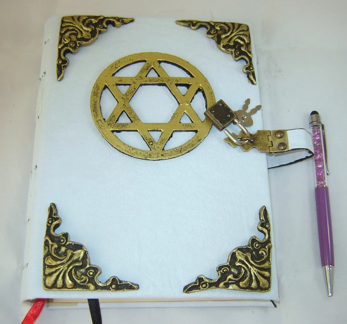 A capa em couro sintético branco traz pureza e força, enquanto o pentagrama dourado modelado à mão em resina e porcelana fria simboliza proteção e conexão com os cinco elementos.